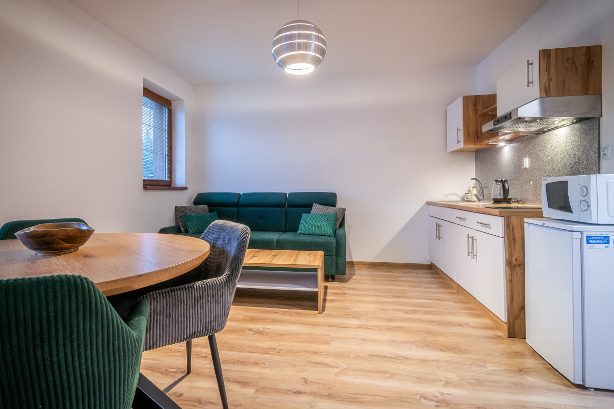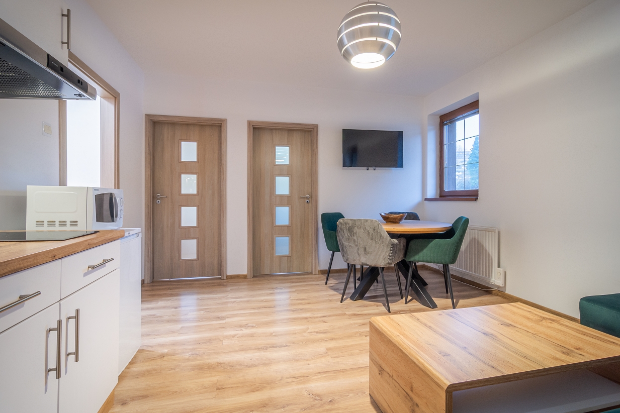 kuchynská linka a jedálenský stôl(sklo – keramická dvojplatňa, chladnička, mikrovlnná rúra, rýchlo varná kanvica, potrebný riad),